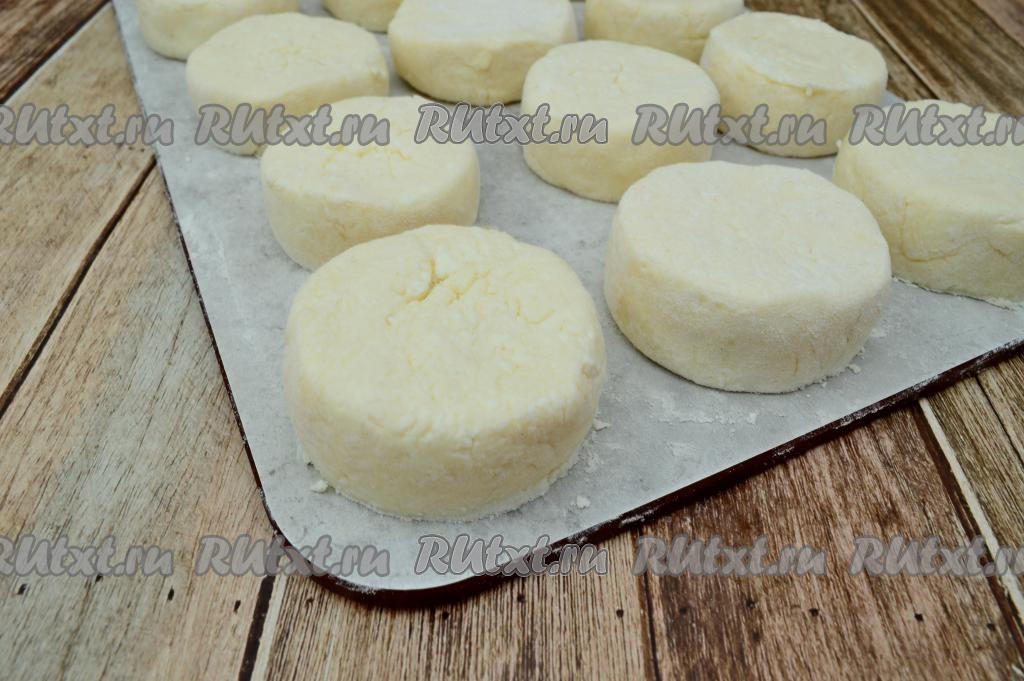 Аналогично сформировать оставшиеся сырники. Выложить их на припорошенную мукой доску. Всего у меня получилось 12 заготовок сырников.