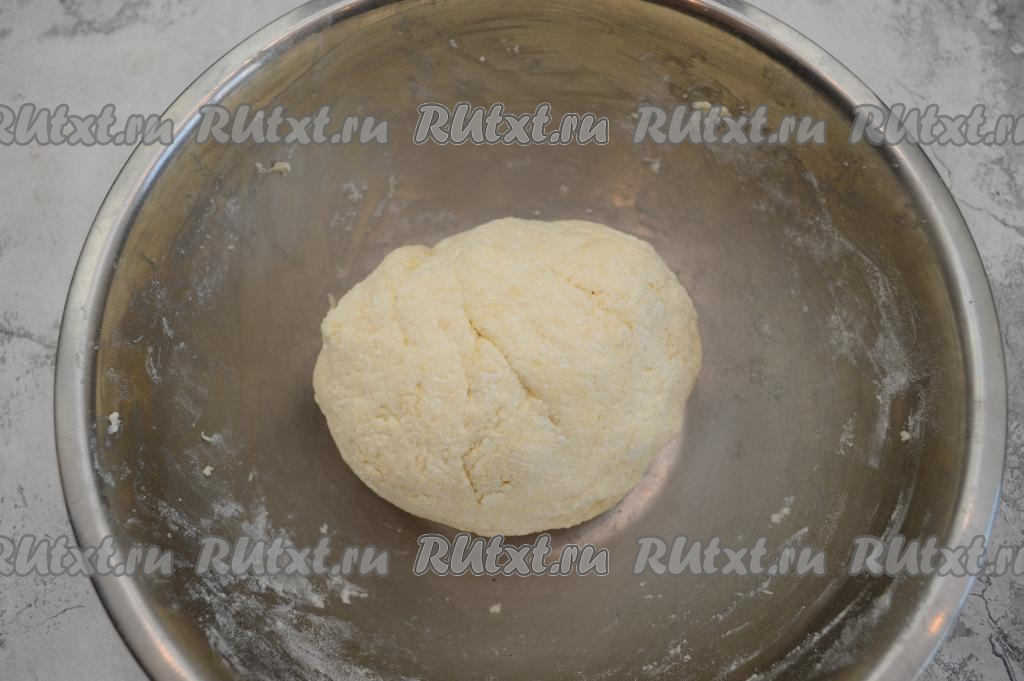 Замесить творожное тесто, которое будет липнущим к рукам, но при этом держать форму. По ГОСТу творог должен быть средней влажности, но если у вас сухой творог, то, возможно, вам потребуется муки чуть меньше, а если влажный - тогда чуть больше. Также количество муки незначительно зависит от размера яйца.