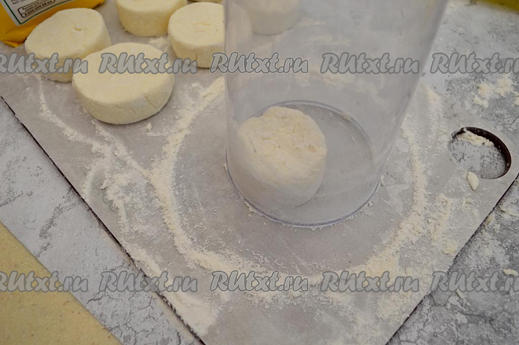 Теперь формуем сырники округлой формы. Для этого идеально подходит стакан для погружного блендера. Припылить поверхность мукой, на муку выложить заготовку сырники, накрыть сверху стаканом и быстро повращать стакан рукой по кругу.