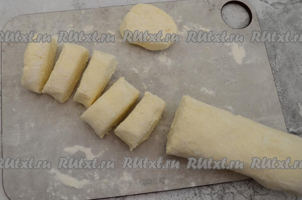 Острым ножом нарезать колбаску на шайбы толщиной около 2 сантиметров (у меня получилось 12 кусочков творожного теста).