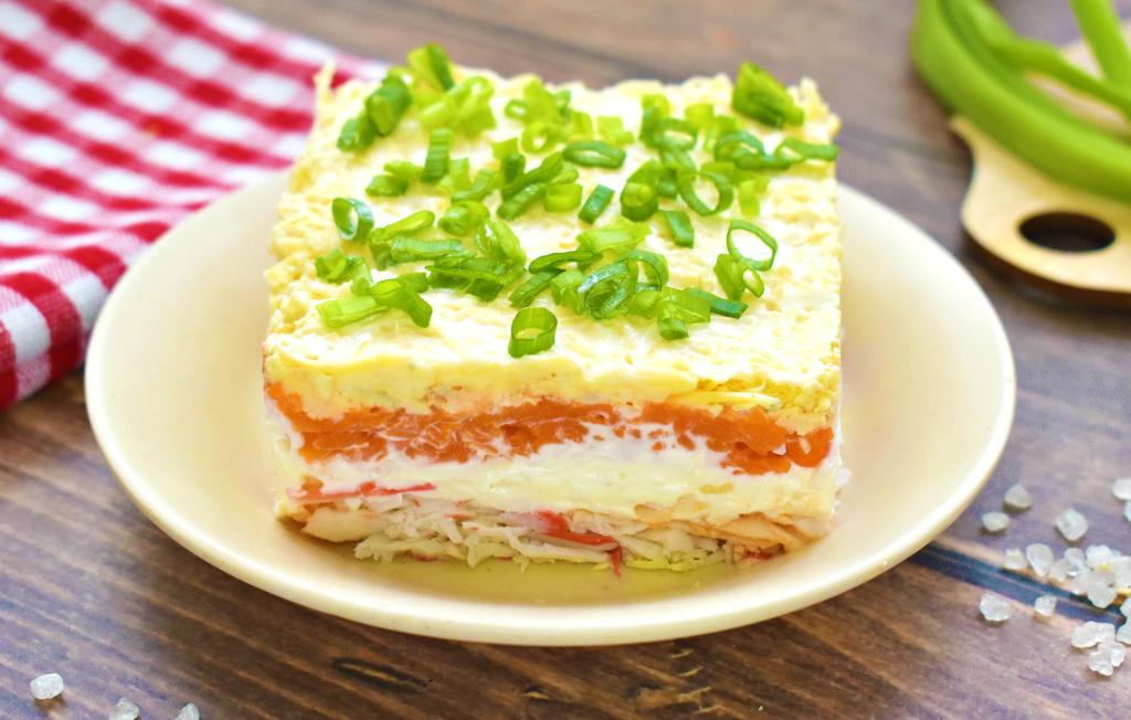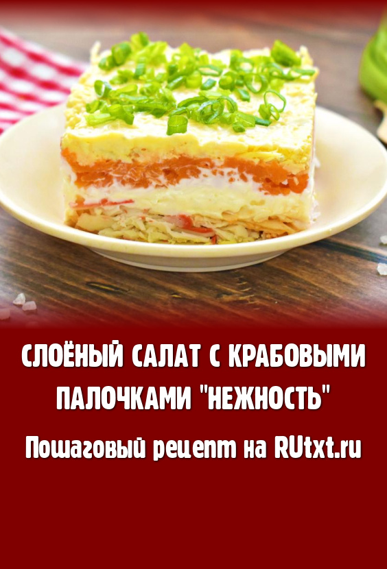 Вкусный, аппетитный слоёный салат "Нежность", приготовленный с крабовыми палочками, полностью оправдывает своё название. Это блюдо станет украшением любого стола!