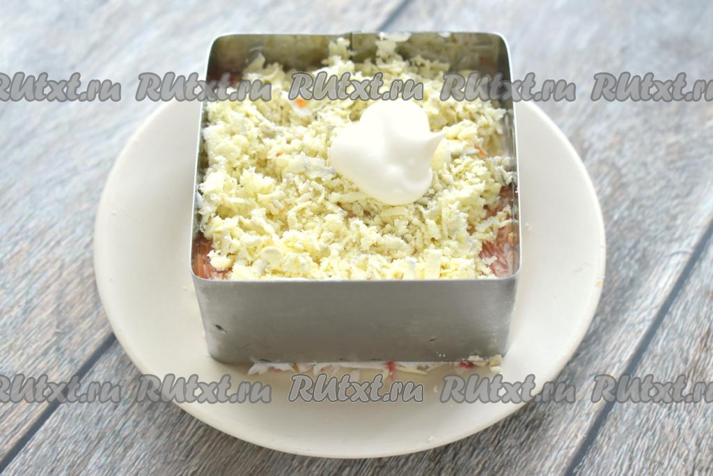 Следующим слоем раскладываем по формам желтки, натёртые на крупной тёрке, покрываем их майонезом.