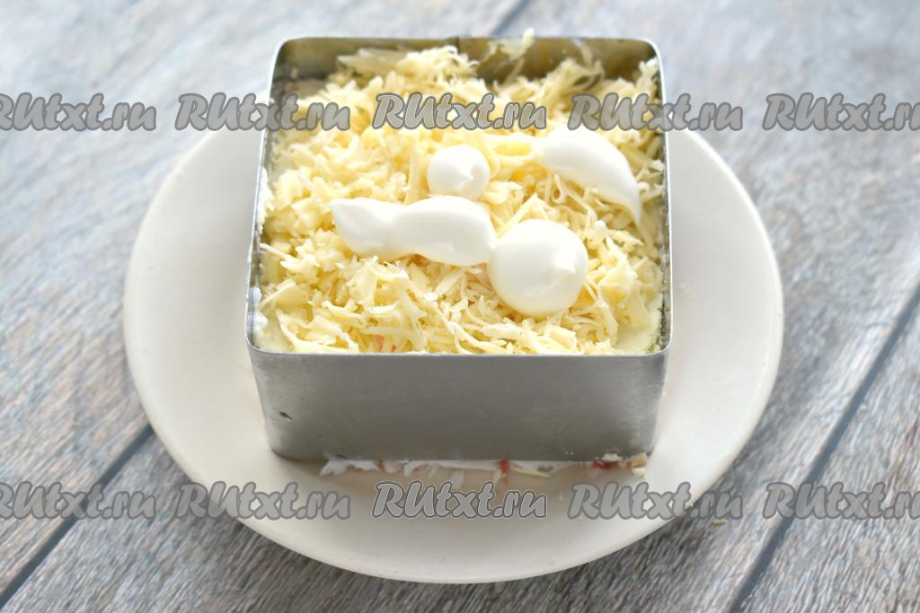 Завершающим слоем салата "Нежность" станет сыр, натёртый на крупной тёрке, тоже смазываем его майонезом.