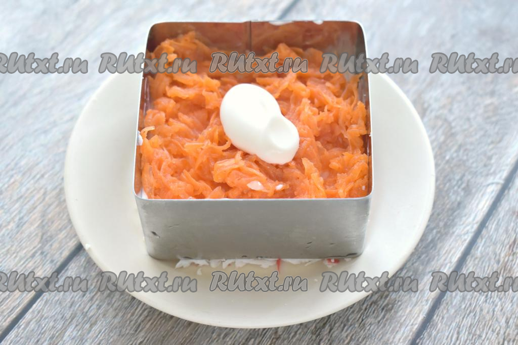Третьим слоем салата равномерно раскладываем по формам морковку, натёртую на крупной тёрке, смазываем этот слой майонезом.
