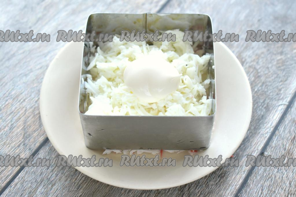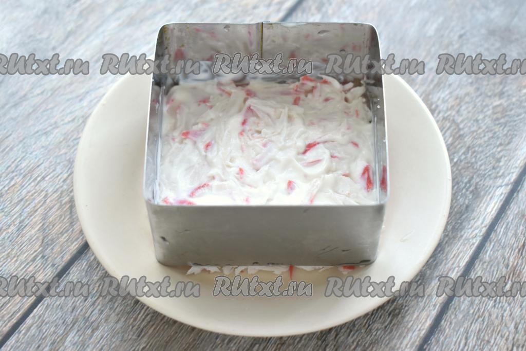 Крабовые палочки, если нужно, размораживаем, достаём из упаковки, натираем на крупной тёрке. На плоскую тарелку ставим сервировочную форму. Я раскладывала ингредиенты по 2 сервировочным квадратным формам со стороной 9 сантиметров, формируя 2 порции салата. Первым слоем в сервировочную форму выкладываем половину натёртых крабовых палочек. Вторую половину натёртых палочек кладём во вторую форму.