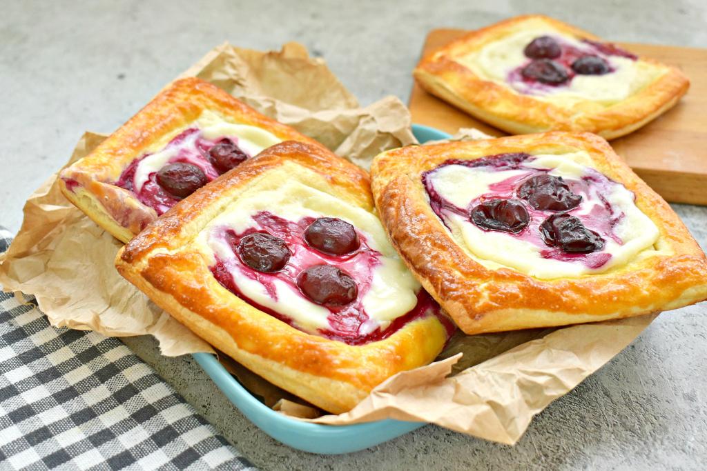 Предлагаю из покупного слоёного теста приготовить в духовке ароматные, вкусные, аппетитные слойки с нежной начинкой из творожного сыра и вишни. Для этой выпечки можно взять и свежие, и замороженные ягоды. Готовятся такие слойки в домашних условиях несложно, а результат превзойдёт все ожидания. Их можно подать и к завтраку, и в качестве десерта после обеда или ужина. Слойки с творожным сыром и ягодами можно есть не только горячими, но и остывшими.