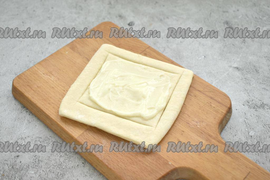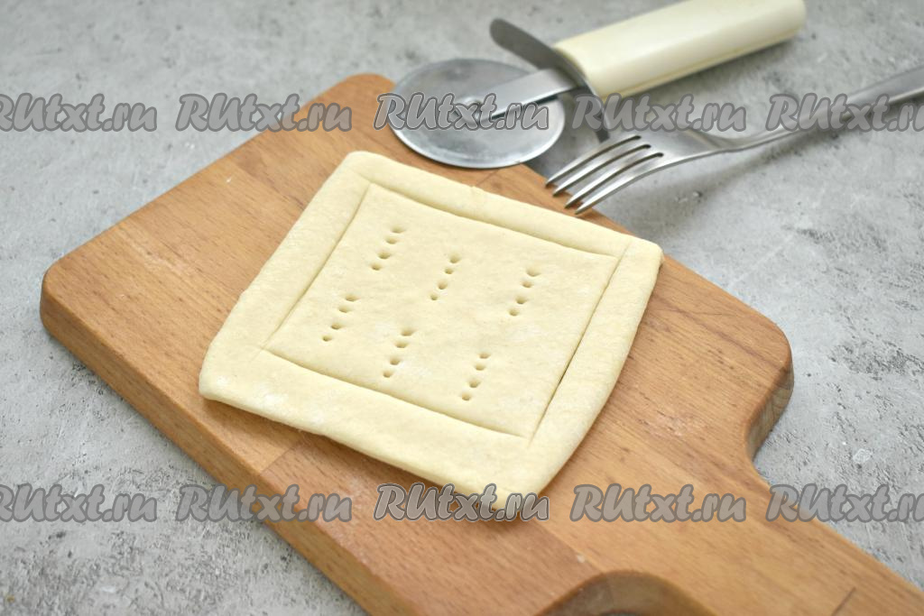 Каждый квадратик теста слегка раскатываем на присыпанной мукой поверхности. С помощью пиццерезки или острого ножа делаем на квадратах надрезы по периметру, отступив от краёв по 1 сантиметра. В центре делаем проколы вилкой.