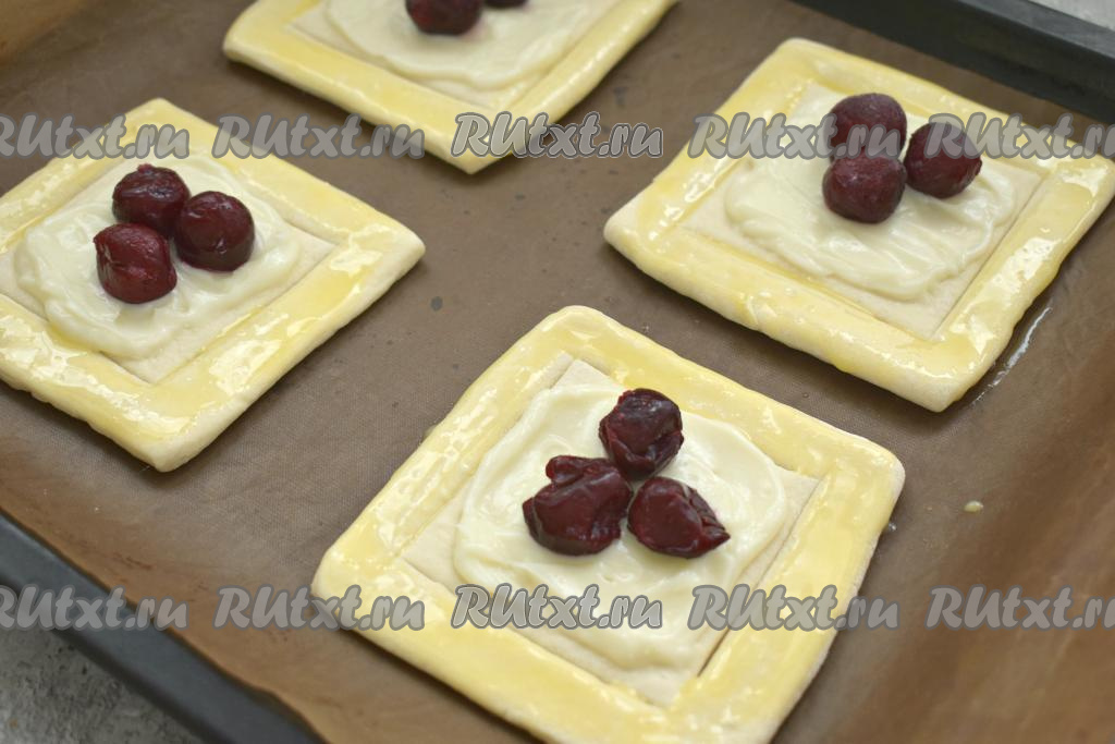 Таким образом формируем все слойки с творожным сыром и вишней, выкладываем их на противень, застеленный ковриком (или пергаментом) для выпечки. Яичный желток взбиваем вилкой. Смазываем края слоек взбитым желтком.