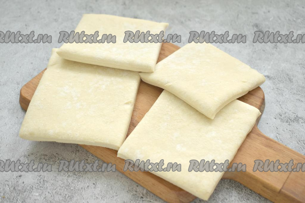У меня слоёное тесто было в двух пластах. Каждый пласт теста разрезаем на 4 квадрата, то есть из двух пластов теста получается 8 заготовок для слоек.