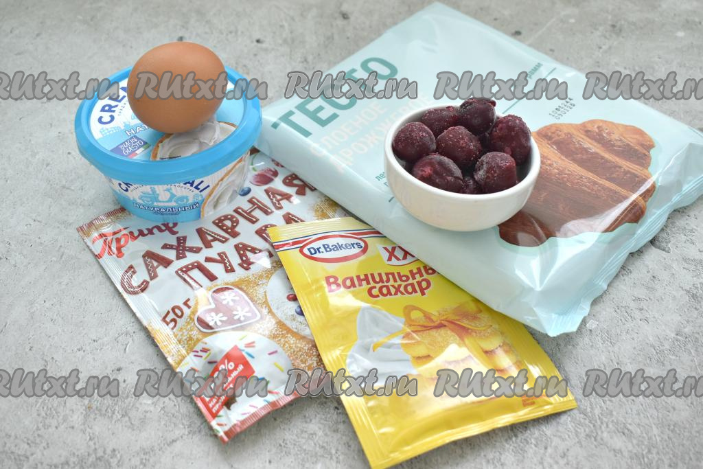 Подготовим нужные ингредиенты. Слоёное тесто предварительно нужно разморозить до мягкости при комнатной температуре. Для этой выпечки можно взять свежую или замороженную вишню.