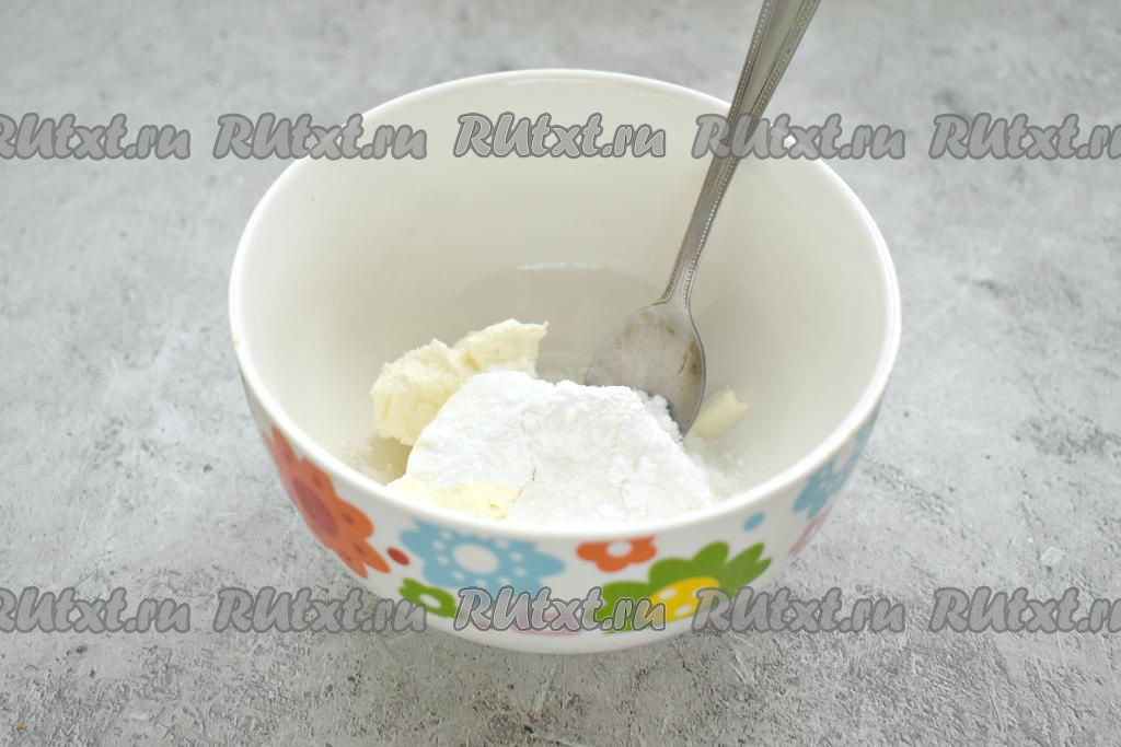 В миску кладём творожный сыр. Всыпаем к нему ванильный сахар и сахарную пудру (или обычный сахар), перетираем вилкой до однородности. Получается нежная творожная масса.