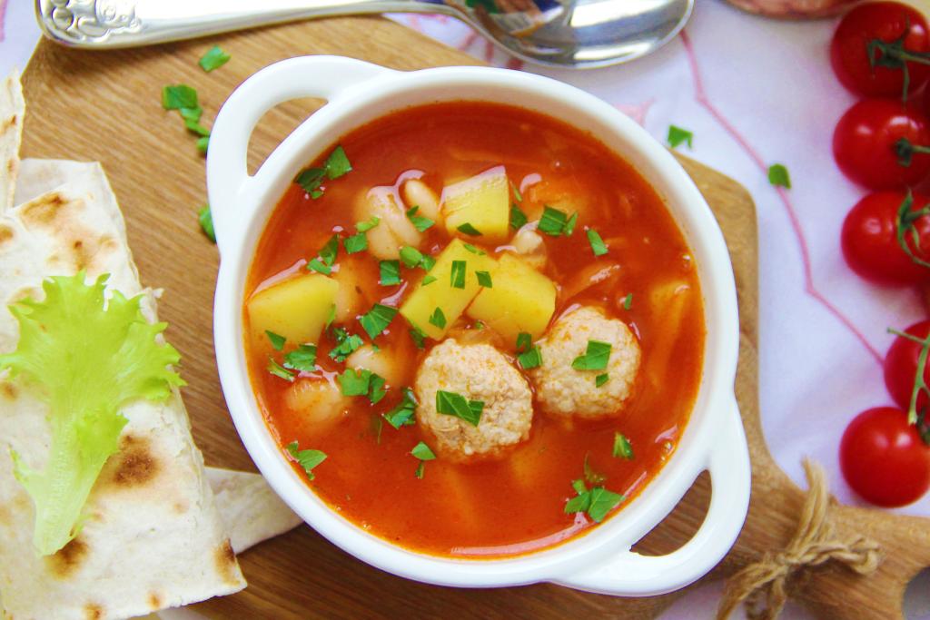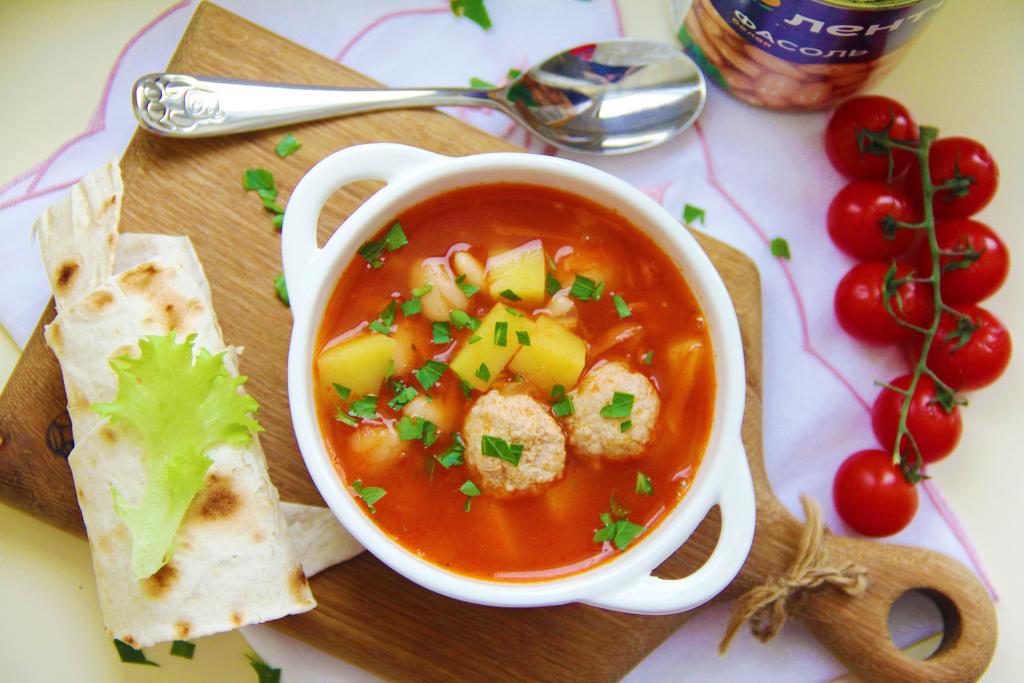 Если вы хотите достаточно быстро подать к столу вкусное, сытное первое блюдо, тогда на выручку придёт этот рецепт. Томатный суп с фрикадельками и белой консервированной фасолью готовится недолго, а получается насыщенным, очень вкусным и аппетитным. При желании при подаче к столу его можно дополнить сметаной или рубленной зеленью.