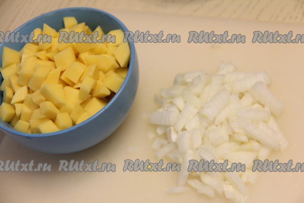 В кастрюлю налить 2 литра воды, поставить на огонь. Картошку нарезать на средние кубики. Лук мелко нарезать.