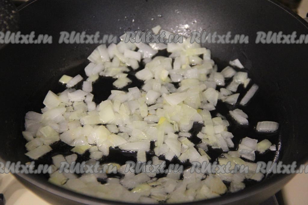 Пока варится суп, займёмся обжариванием овощей. Для этого в сковороде нужно очень хорошо прогреть немного растительного масла, после этого выложить мелко нарезанный лук и обжаривать его минут 3-4 (до прозрачности) на среднем огне, периодически перемешивая.