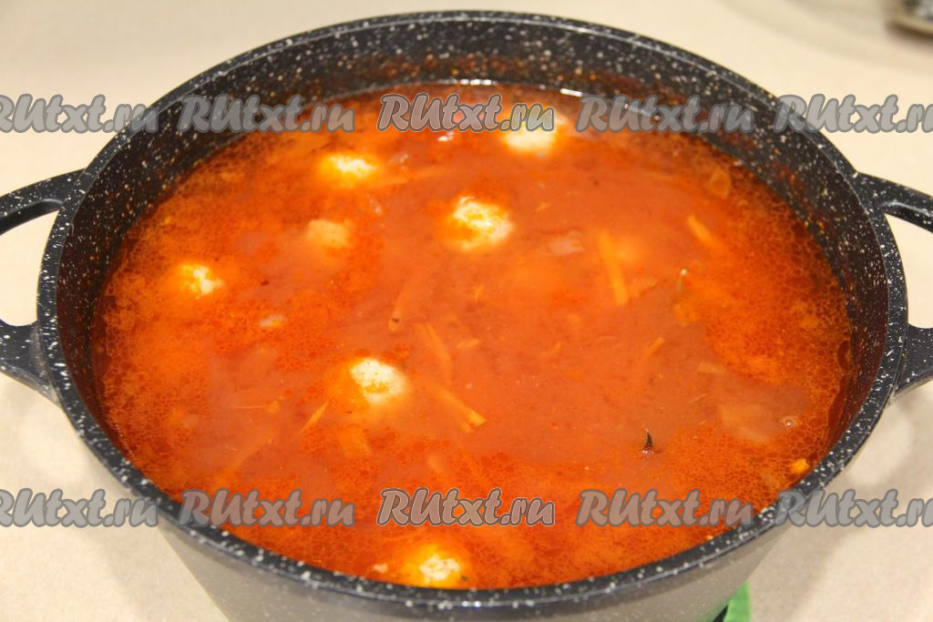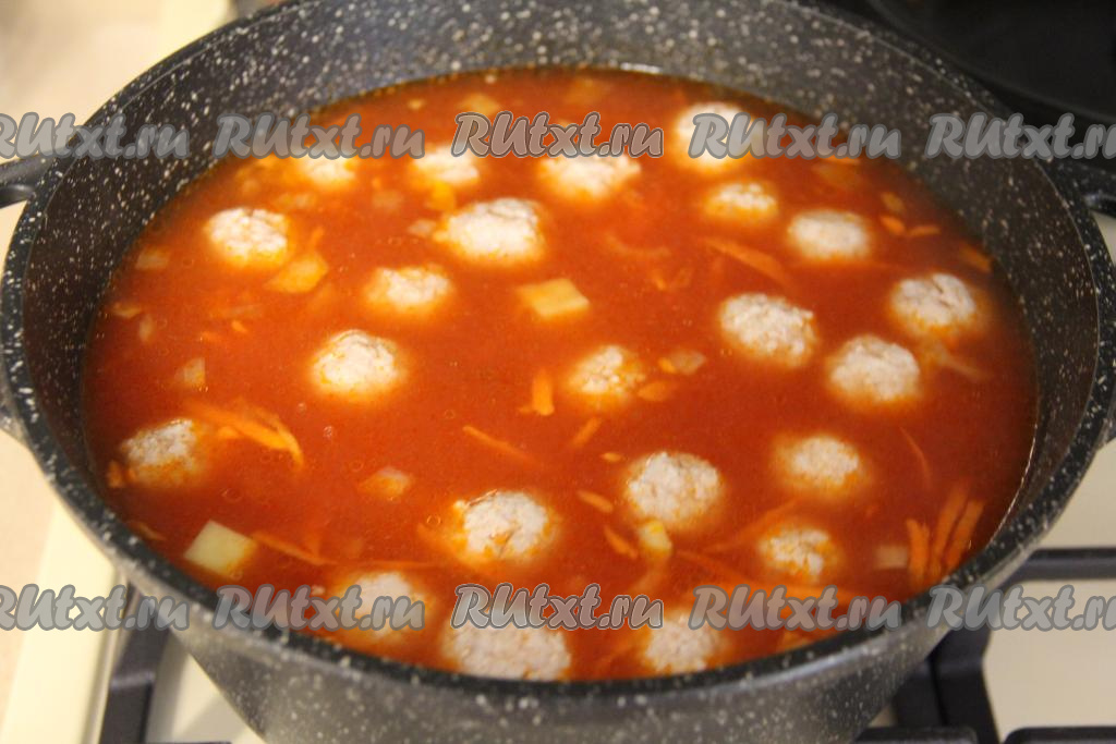 После того как суп с фрикадельками с момента закипания проварится 15 минут, добавить в кастрюлю овощи, обжаренные в томате, довести суп до кипения.