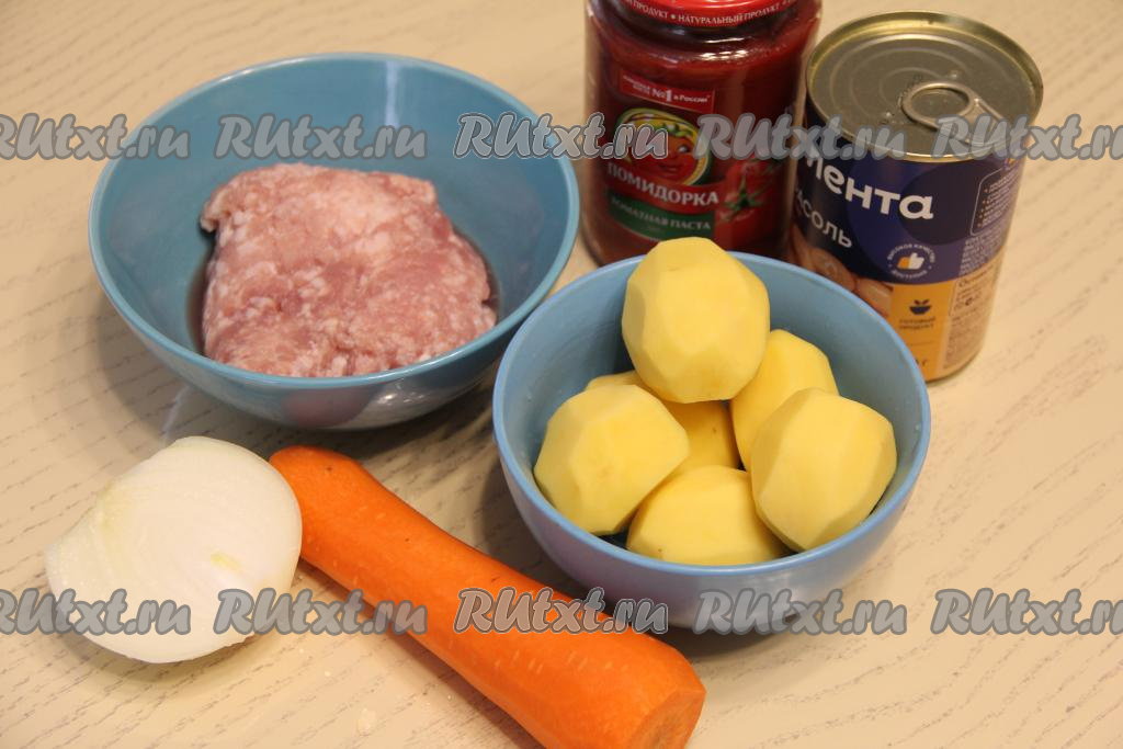 Подготовить продукты. Для получения фарша пропустить кусочки мяса через мясорубку. Можно взять и покупной фарш. Выложить фарш в миску, посолить, перемешать. Почистить картошку, морковь и лук. У меня был крупный лук, поэтому я взяла половину луковицы.