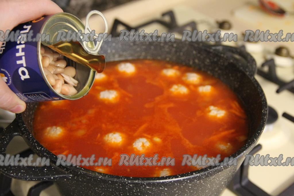 Открыть банку с белой консервированной фасолью, слить излишки жидкости и добавить фасоль в закипевший суп. Посолить по вкусу, довести томатный суп с фрикадельками и фасолью до кипения, затем убавить огонь.