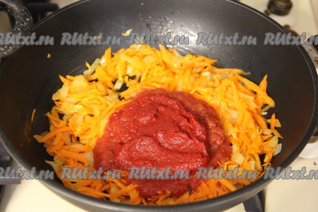 Обжарить овощи, периодически помешивая, в течение 5 минут (до мягкости морковки), затем добавить томатную пасту, перемешать.