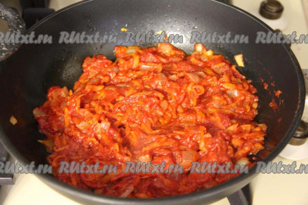 Обжаривать овощи в томате 2-3 минуты, периодически помешивая, убрать с огня.