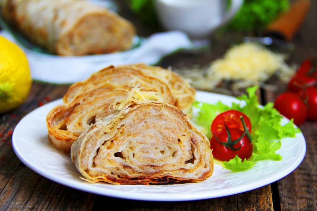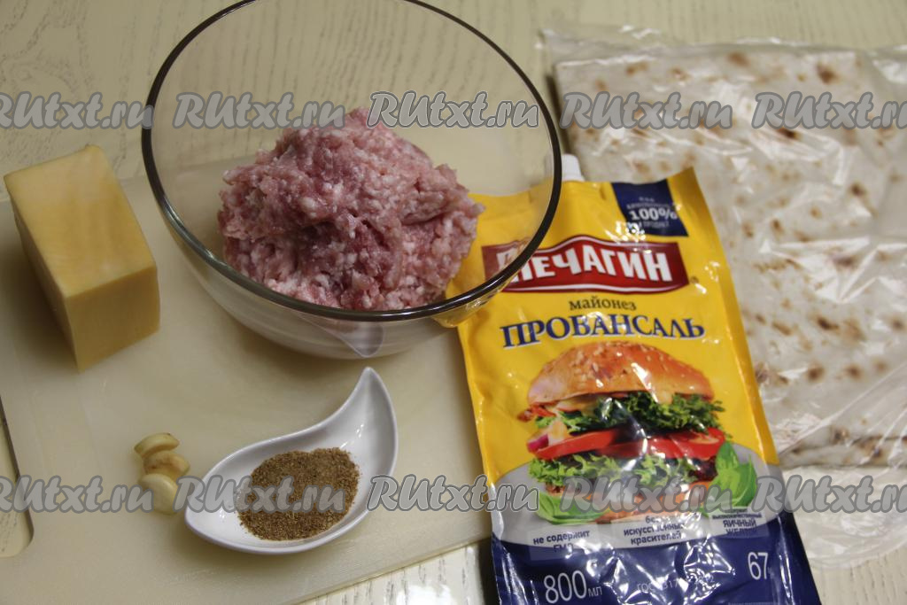 Вкусный, аппетитный рулет из лаваша с начинкой из фарша и сыра разложить на плоском блюде и подать в качестве холодной закуски к столу.