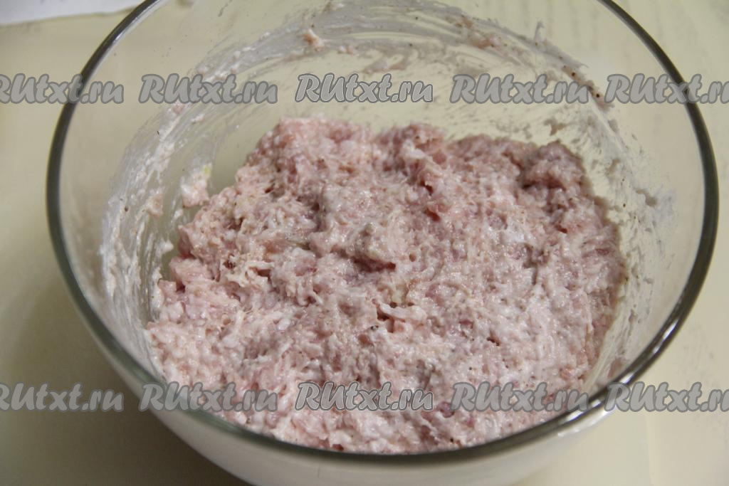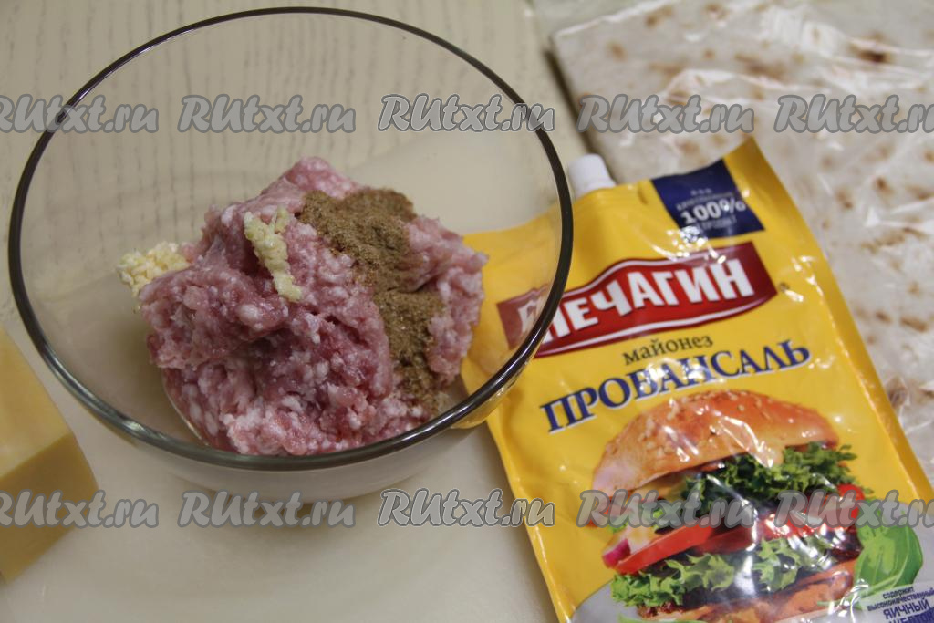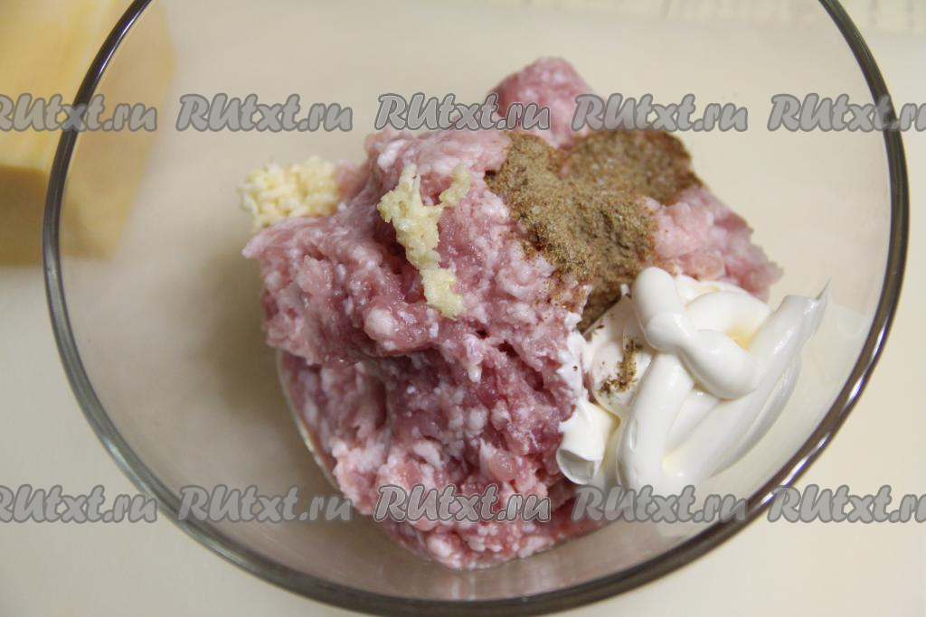 Хорошо перемешать фарш с майонезом и чесноком.