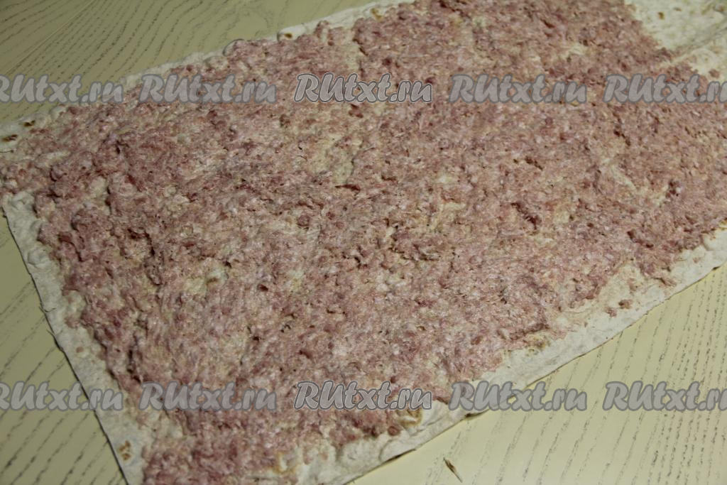Лист лаваша смазать фаршем, немного отступив от краёв, получится тонкий слой фарша.