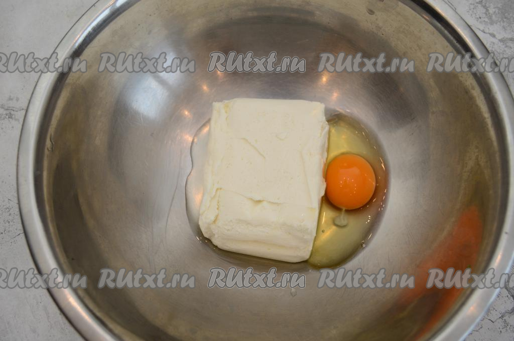 В миску выложить творожную массу и вбить сырое яйцо.