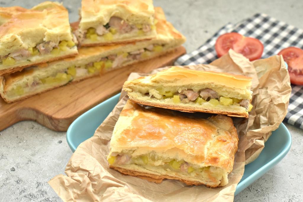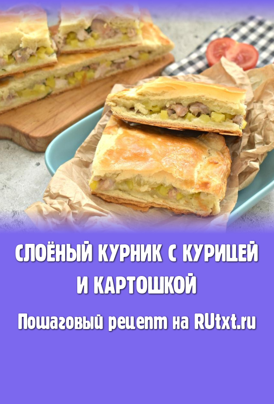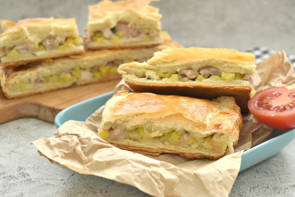 Вкусный, сытный курник, приготовленный из слоёного теста с сочной начинкой из курицы и картошки, достаём из духовки, даём ему немного остыть и подаём к столу. Этот домашний пирог хорош и в горячем виде, и в уже остывшем. Обязательно испеките такой курник для своей семьи!