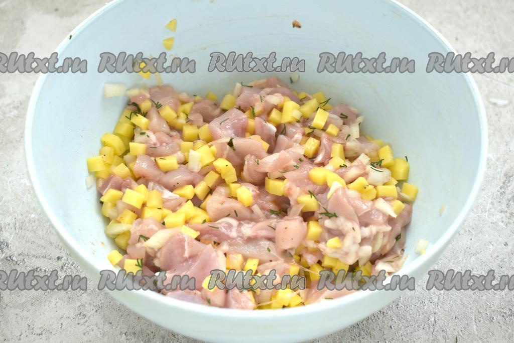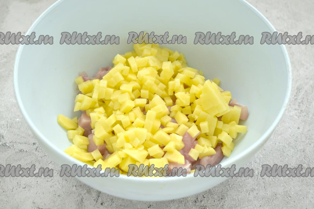 Картошку чистим, тоже нарезаем на очень маленькие кубики, перекладываем в миску с мясом курицы.