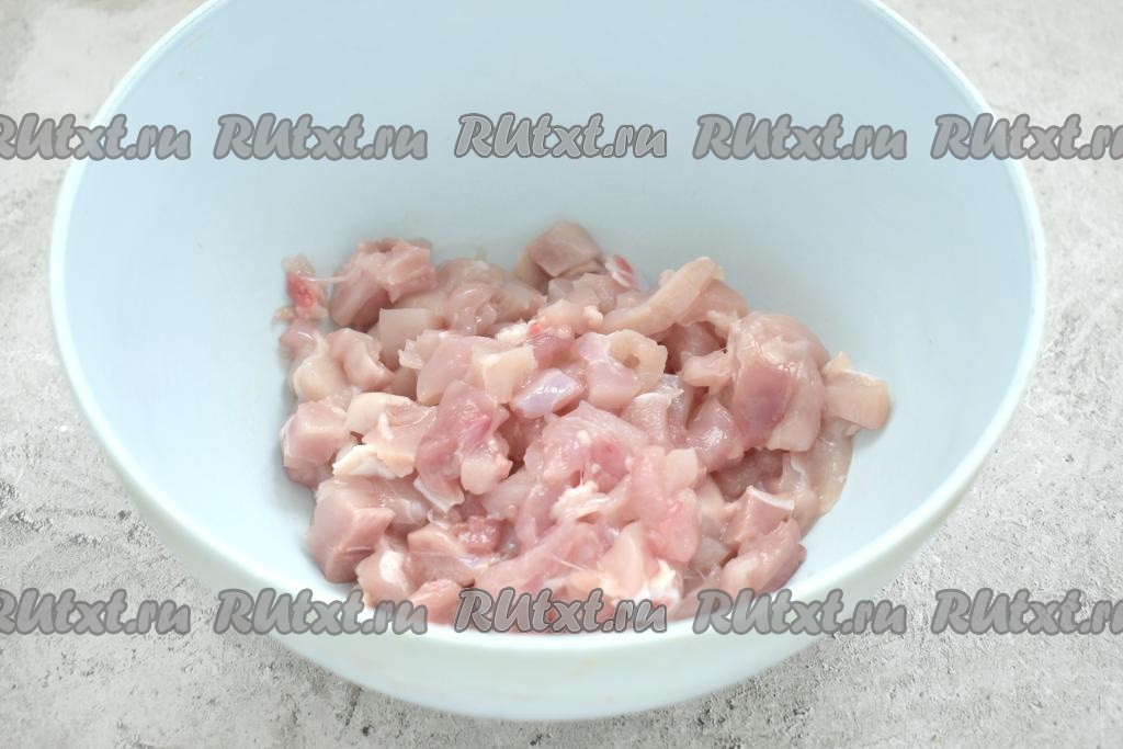 Заранее достаём из морозилки слоёное тесто (у меня тесто было в двух пластах) и оставляем его размораживаться при комнатной температуре. Моем мясо курицы (я взяла 2 окорочка, удалила с них кожу, срезала мясо с костей), обсушиваем. Нарезаем куриное мясо на очень маленькие кубики, перекладываем их в миску.