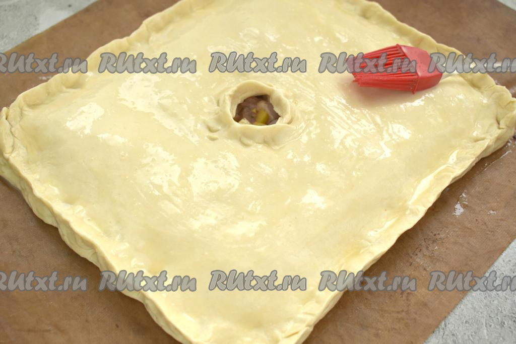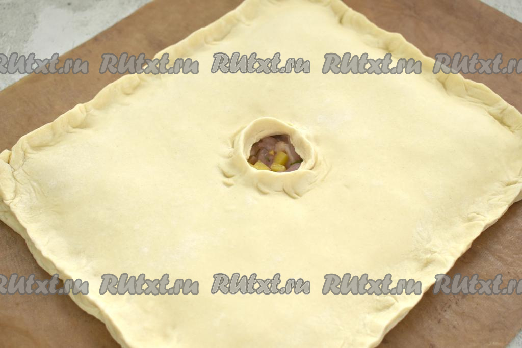Второй пласт теста на присыпанном мукой столе тоже раскатываем до толщины 3 миллиметра. Этим пластом теста накрываем тесто с начинкой. Скрепляем края курника со всех сторон, в центре делаем отверстие для выхода пара.