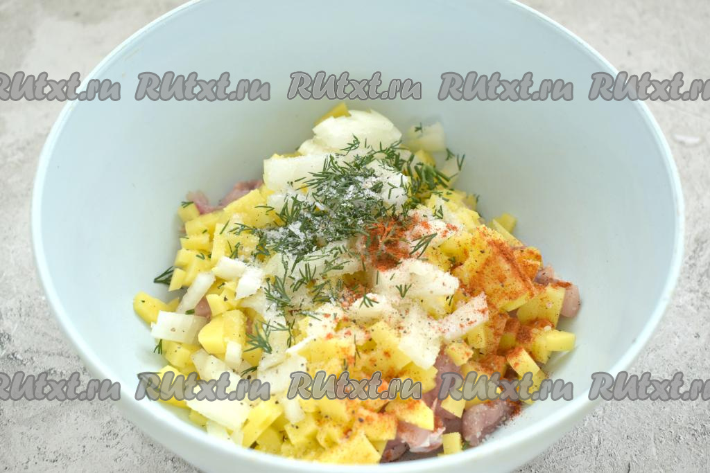 Зелень моем, обсушиваем, нарезаем. Очищенную луковицу нарезаем на небольшие кусочки. Лук и зелень добавляем в миску с курицей и картошкой. Содержимое миски по вкусу солим, приправляем любимыми специями (я использовала чёрный молотый перец и молотую паприку).