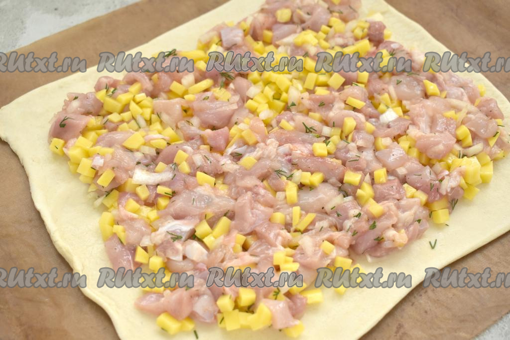 Немного присыпаем стол мукой, выкладываем первый пласт теста и раскатываем его до толщины примерно 3 миллиметра. Раскатанное тесто перекладываем на противень, застеленный ковриком (или пергаментом) для выпечки. Затем, отступив от краёв теста 1,5-2 сантиметра, ровным слоем выкладываем начинку из курицы и картошки.