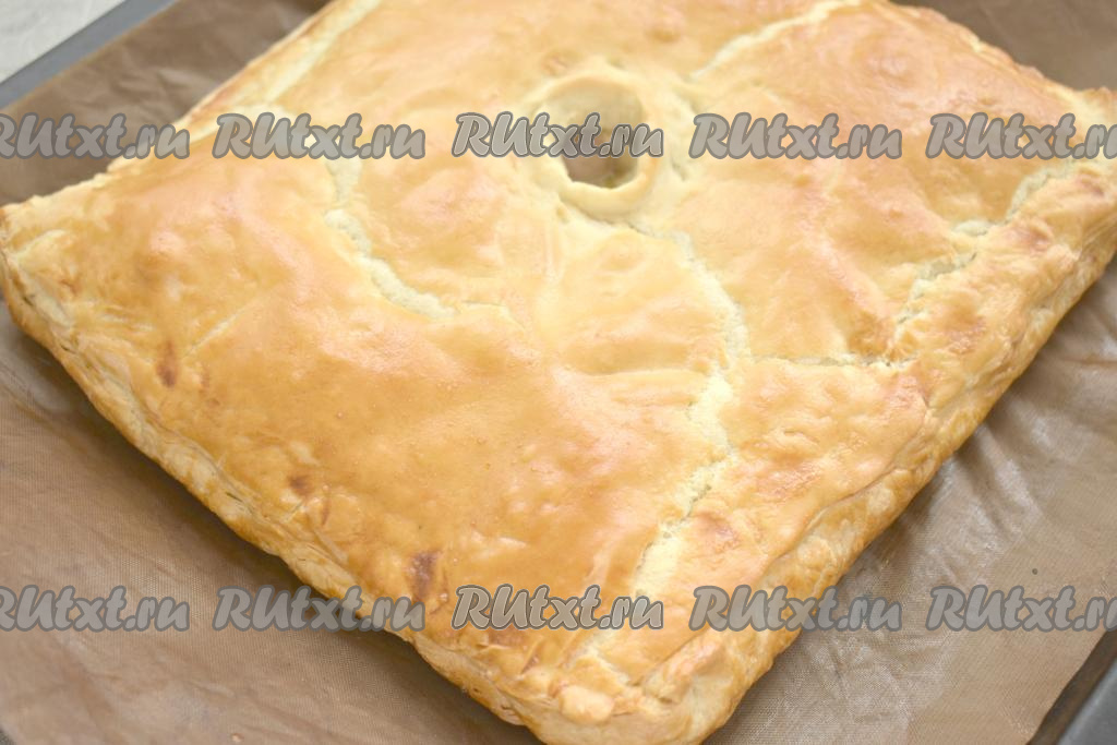 Отправляем противень с курником с курицей и картошкой в разогретую до 180 градусов духовку. Выпекаем 40-45 минут. Если по прошествии минут 30 с начала выпечки слоёное тесто начнёт сильно подрумяниваться, тогда, для того чтобы пирог не подгорел, можно прикрыть его сверху пергаментом. Очень важно, чтобы не только тесто подрумянилось, но и начинка из куриного мяса и картошки успела приготовиться.
