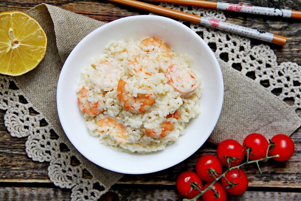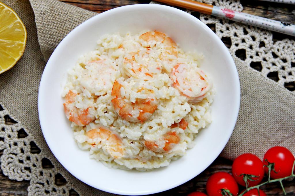 Перемешать, прогреть рис с креветками в сливочном соусе на небольшом огне 2-3 минуты, время от времени перемешивая, и блюдо готово.