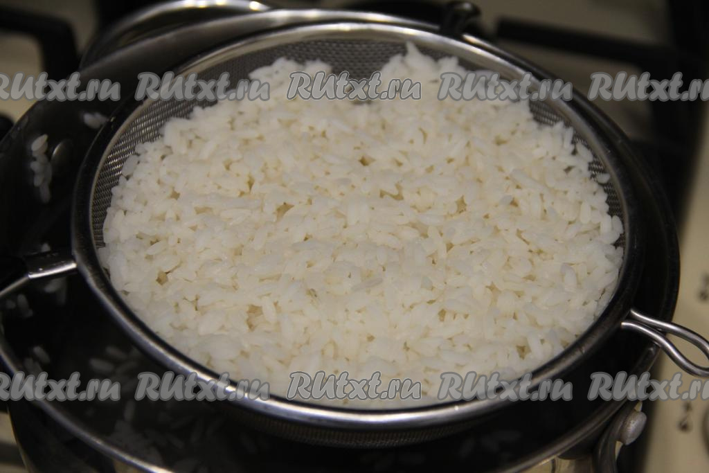 Готовый рис откинуть на сито и дать стечь воде.