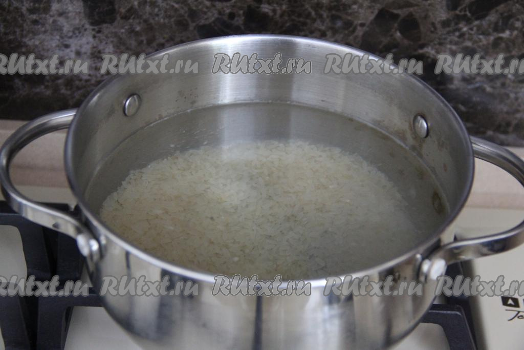 В кастрюлю налить достаточно большое количество воды, подсолить, поставить на огонь, довести до кипения. Рис промыть водой, дать стечь лишней воде. В кастрюлю с закипевшей подсоленной водой всыпать рис, перемешать, ещё раз дать воде закипеть, а затем варить рис на небольшом огне до готовности (минут 20).