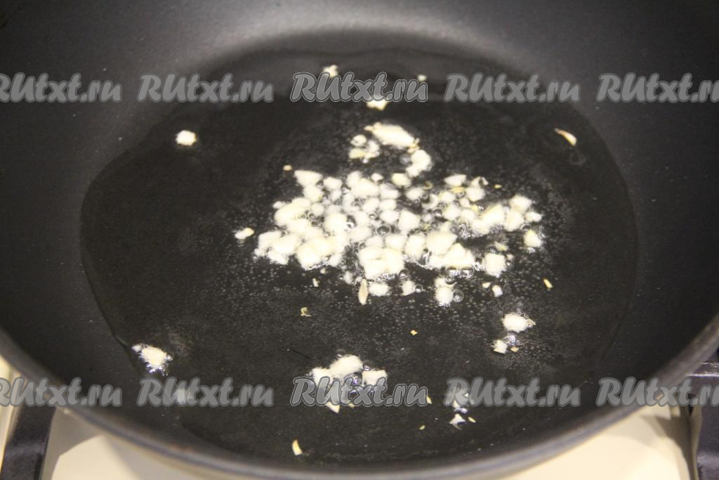 В сковороду влить растительное масло, хорошо прогреть его, выложить мелко нарезанный чеснок и обжарить его 1 минуту, периодически помешивая.