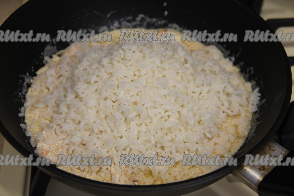 Всыпать варёный рис в сковороду с креветками и сливочным соусом.