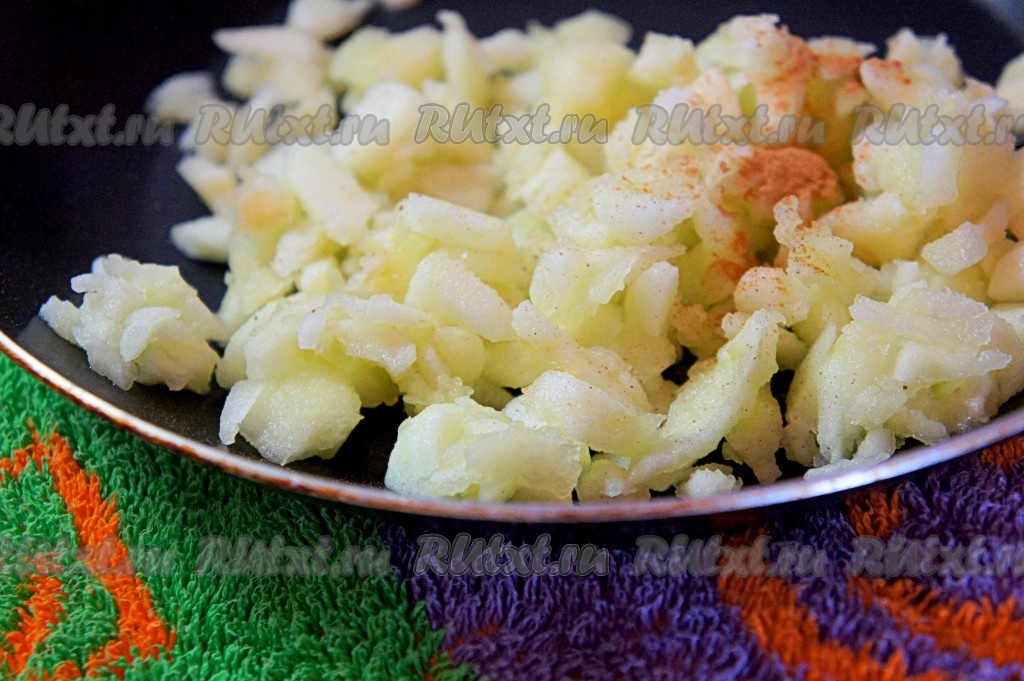 Мякоть яблок мелко нарезать, удаляя косточки, переложить в сковороду, добавить корицу, 2-3 столовых ложки воды и потушить на среднем огне в течение 2-3 минут, помешивая, затем дать остыть.