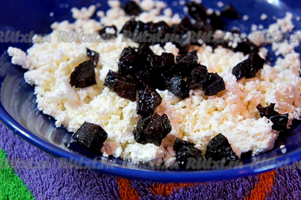 Чернослив (или изюм, или курагу) промыть, обдать кипятком, обсушить на бумажном (или тканевом) полотенце. К творогу добавить мелко нарезанный чернослив (или изюм, или нарезанную курагу), перемешать.