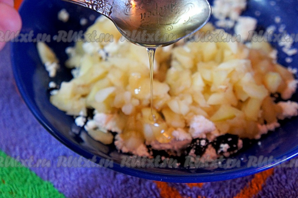 К творожной начинке добавить тушёные яблоки и, по желанию, мёд, перемешать и немного начинку размять ложкой. Мёд, на самом деле, можно и не добавлять, так как начинка будет достаточно сладкой, пропитавшись в процессе запекания сухофруктами и яблоками.