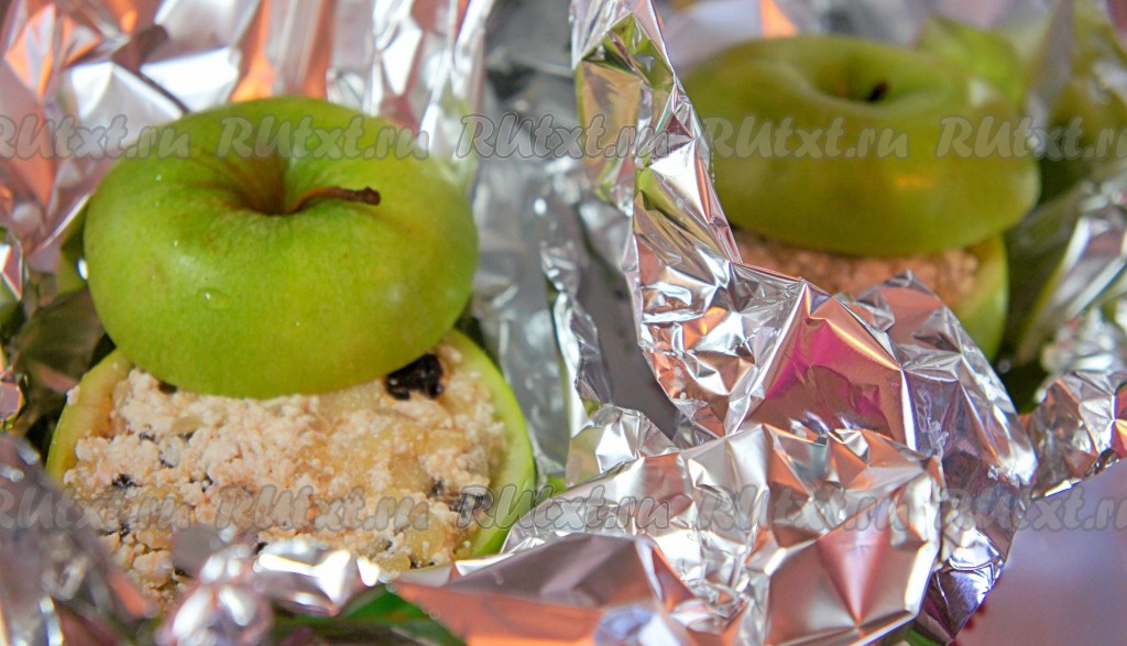 Наполнить творожно-яблочной начинкой яблоки, немного "утрамбовать" начинку руками. Накрыть яблоки "крышечками", завернуть их плотно в фольгу. Яблоки, фаршированные творогом и завёрнутые в фольгу, поместить в форму для запекания. На дно формы налить немного воды. Отправить яблоки запекаться в предварительно разогретую до 200 градусов духовку на 15-20 минут. За 5-7 минут до окончания запекания немного приоткрыть фольгу и запекать яблочки оставшееся время (до готовности). Запечённые яблоки должны стать достаточно мягкими, но при этом хорошо держать форму.