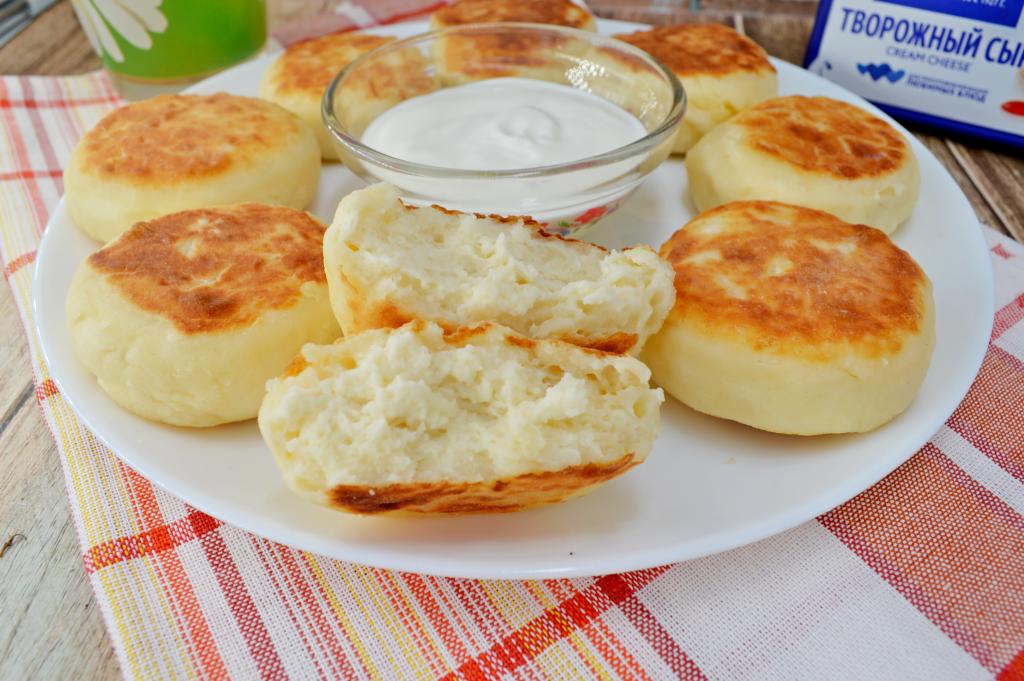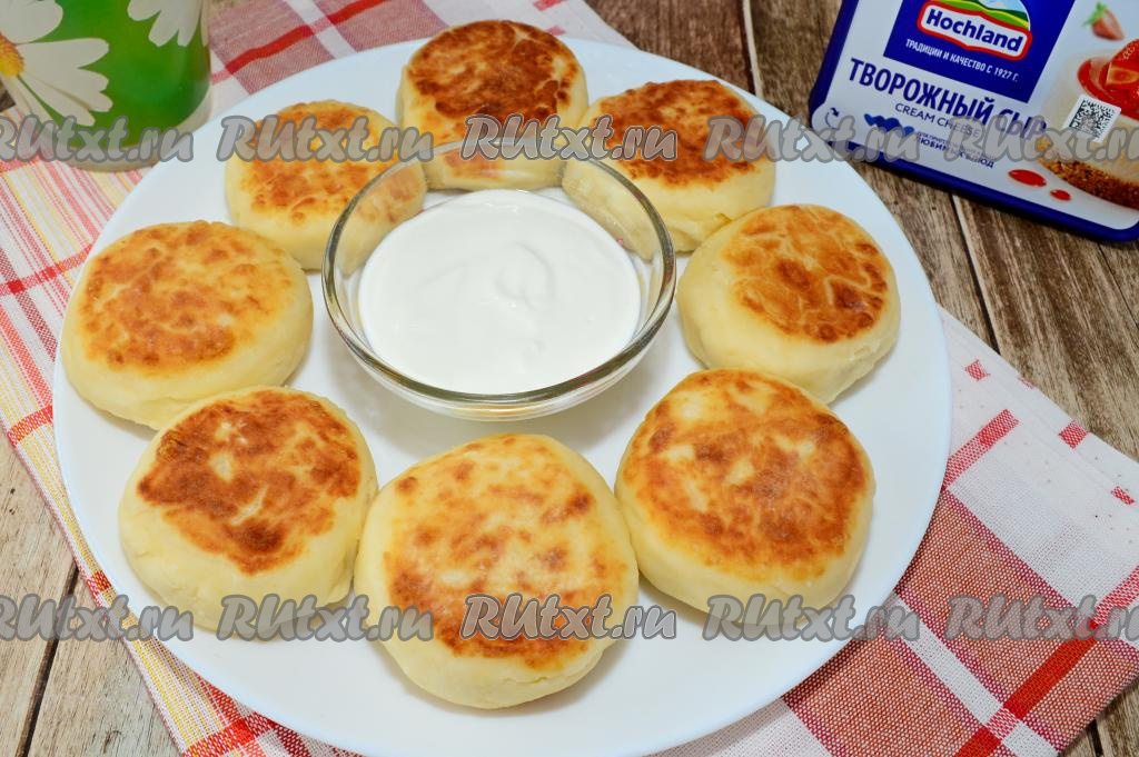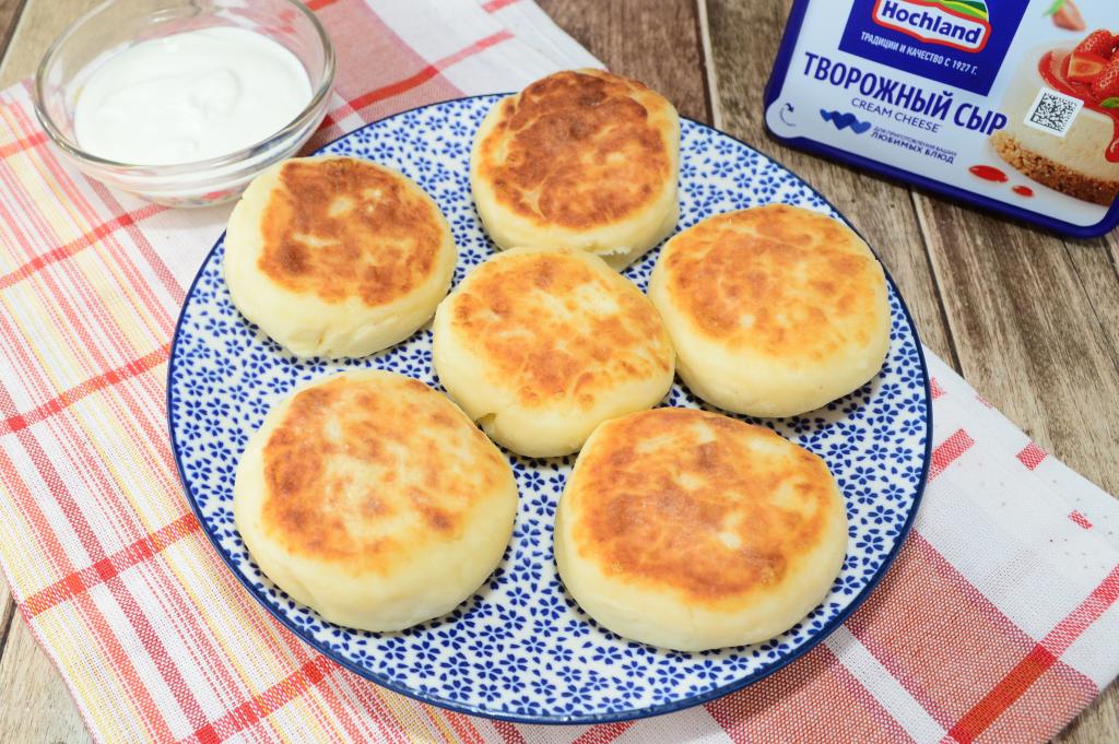 Сковороду хорошо разогреть с растительным маслом, затем выложить заготовки сырников. Жарить сырники из творожного сыра на среднем огне чуть дольше, чем обычные (примерно по 3-4 минуты с каждой стороны). Они должны хорошо прожариться внутри. Можно дополнительно в конце жарки выключить огонь, перевернуть сырники и подержать их 5 минут под крышкой, чтобы они хорошо пропарились.