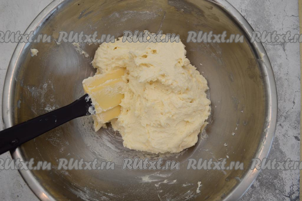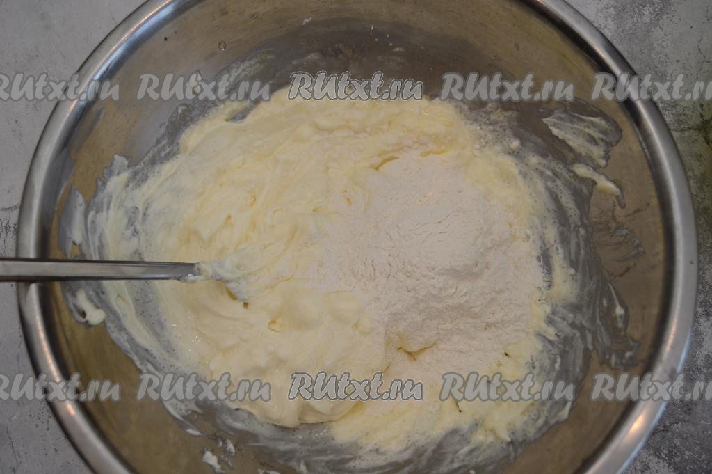 Вилкой перемешать творожную массу до однородности. Всыпать половину муки.