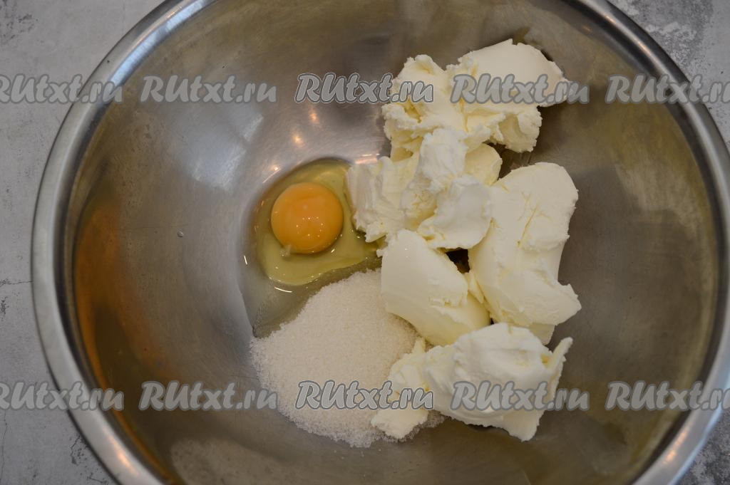В миску всыпать сахар, вбить сырое яйцо и выложить творожный сыр.