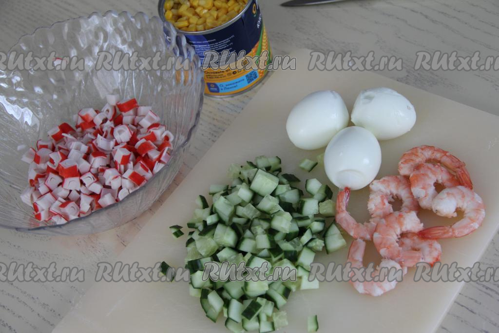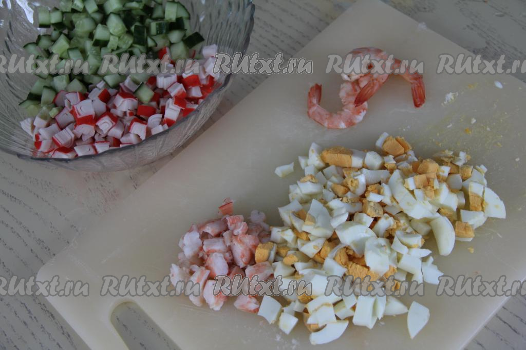 В салатнике соединить нарезанные крабовые палочки и огурцы. Яйца тоже нарезать на мелкие кубики. Некрупно нарезать креветки (при желании несколько креветок можно оставить целыми для украшения блюда, но это необязательно).