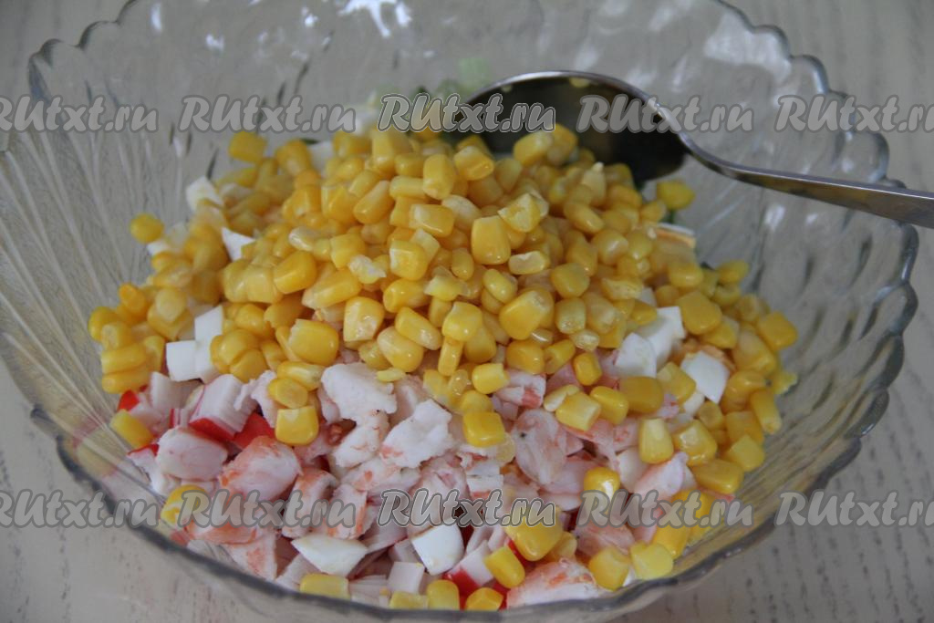 Добавить в салатник кукурузу без жидкости, нарезанные креветки и яйца.