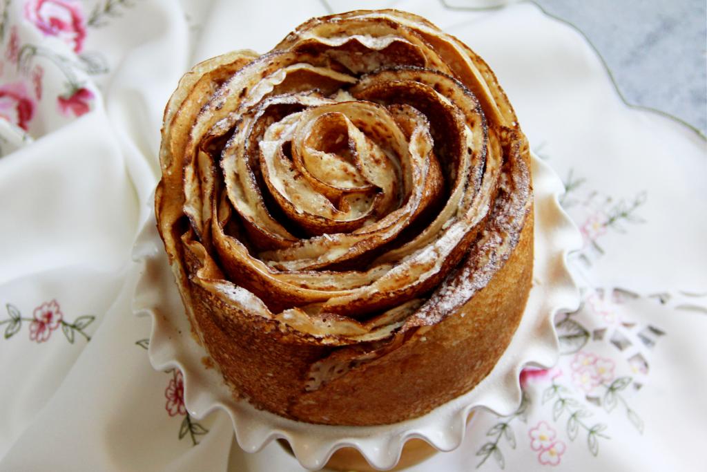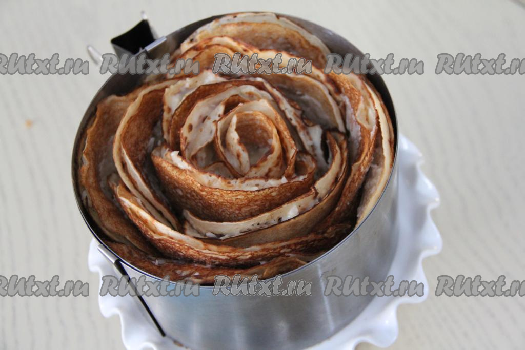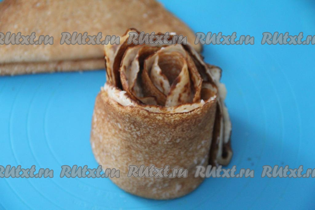 А дальше снова сформировать полоску из трёх блинов, смазанных кремом и выложенных внахлёст. Обернуть получившуюся полоску вокруг рулета из блинов, прижимая слои друг к другу. Таким образом постепенно сформировать весь блинный торт "Роза".