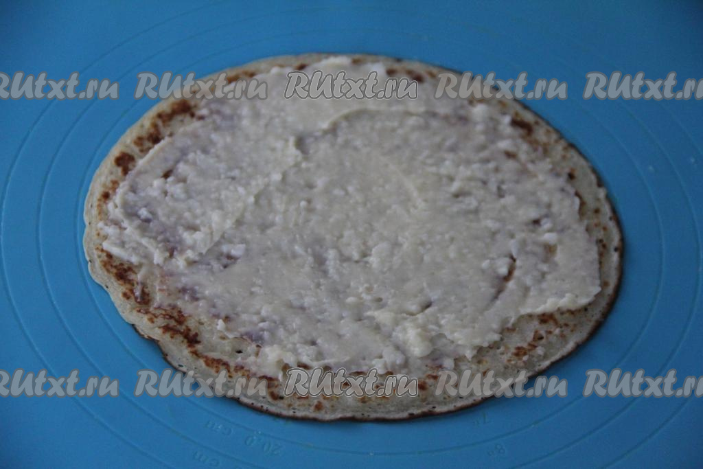 Смазать остывший блин частью заварного крема, немного отступив от краёв блинчика.